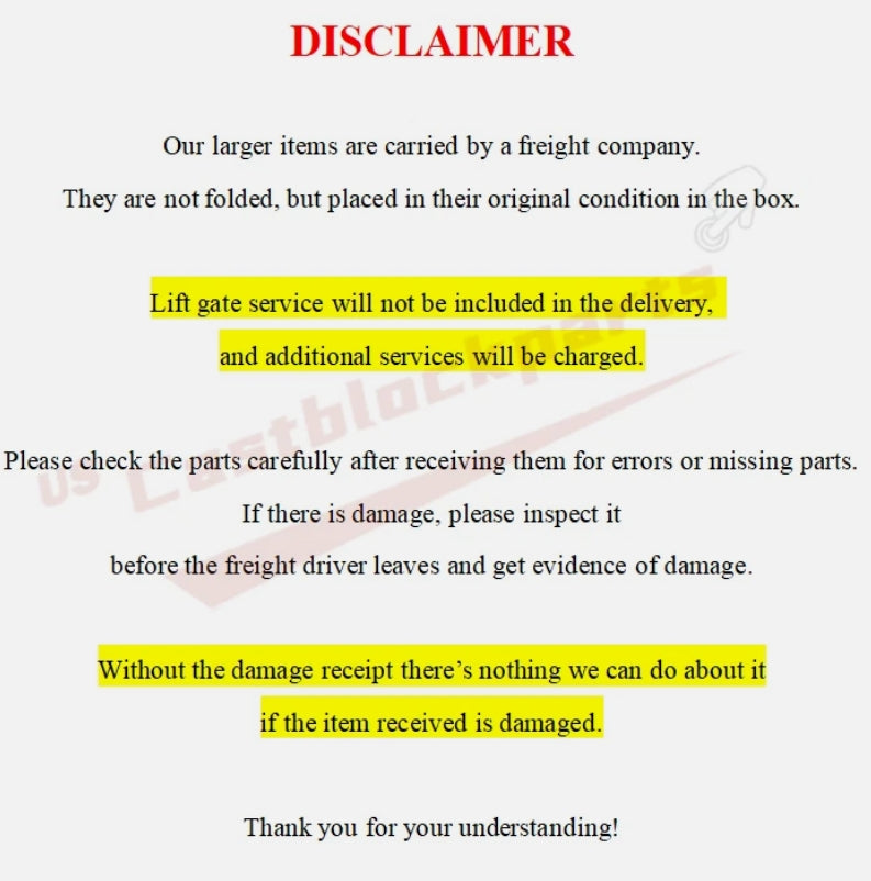 Friendly note: The delivery will not include lift door service (similar to forklift ,internal delivery service, handling service). Because there is an extra charge. If you need this service, please contact us in advance. Thank you for your understanding.